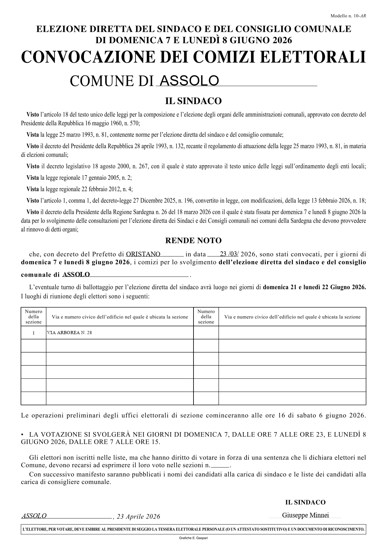 convocazione comizi elettorali per le elezioni comunali Regione Sardegna - Modello n 10-AR 1 (880,69 KB - Pubblicato il 24/04/2026)